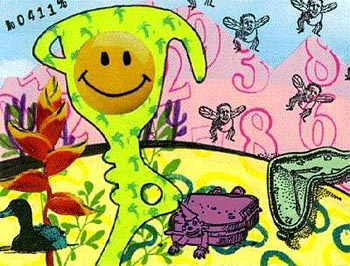 smiley face found picture, glued the green thing down and outlined it in thin black marker to set