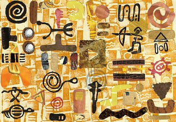 Collage for Tribal Swap Copyright © 1997 I made this collage with hand carved rubber stamps and collage elements for a swap with folks on the Carving Consortium listserv. The theme was "Tribal Arts". For inspiration, I searched for images of petroglyphs from various ancient cultures. I used a total of thirteen stamps I carved in this project. Some of the stamps are actual petroglyph designs, some are imaginary. I started out my design by stamping each stamp on scrap paper and then cutting it out. I moved the cut outs around on a backing piece of scrap paper until I had an arrangement I liked, then I glued them down and drew various abstract shapes among them. The abstract shapes would be cut from various scrap papers. I traced all to use as a template for cutting out the shapes. I made two different pieces using the same composition. One was on handmade paper, and one was on cardstock with a stamp pattern in ochre yellow all over the background. This is the version pictured above. I used an ordinary glue stick to attach all the colored paper bits. I have two big boxes of paper scraps that I've been saving for twelve years. One is black and white, one is color. I took the box of color scraps and just started pulling out all the earth tones, cutting four or five shapes out of each color and randomly distributing them over both collages until I had all the shapes cut out. After they were glued down, I added the rubber stampings - mostly black, a few burgundy, one blue. I then had the finished collages color copied and cut them apart (I copied two per 8.5" x 11" page). I mounted them on backing paper with a stamped border. I sent twelve copies to the person coordinating the swap. She bound all the submissions into books and we each recieved a copy. If you would like to see all of the Tribal Arts Swap entries, visit Betty Goetz's web site. |