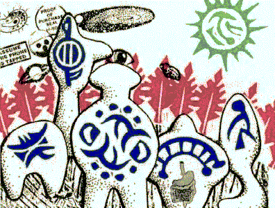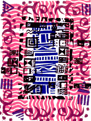 Here is a post card that I sent out in the mail last year. It started out as a swap project and I made some extras for some of my mail art contacts. It started out as a combination collage/drawing which I hac copied onto card stock. Then I rubber stamped onto them to add color. I make a lot of cards this way to send as mail art.